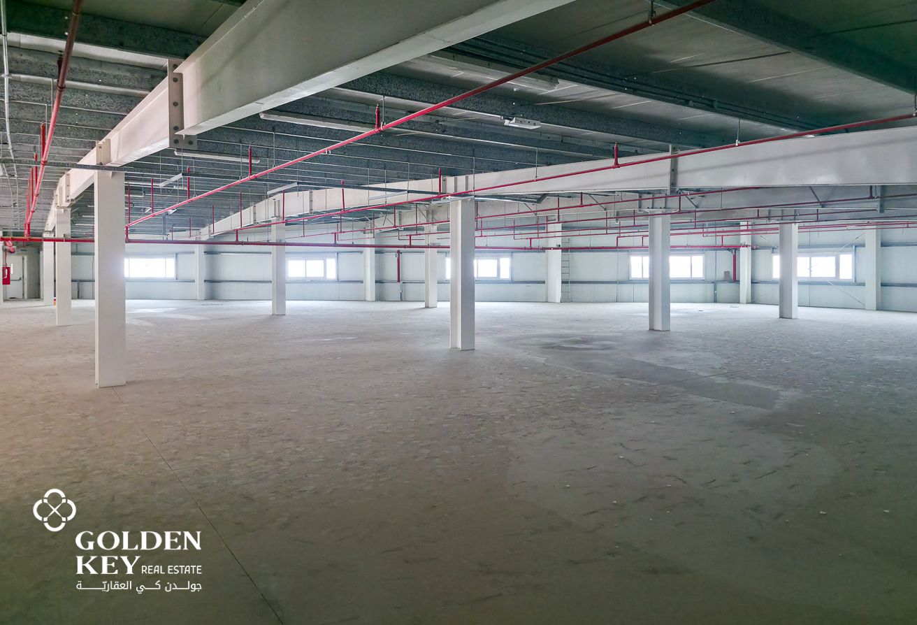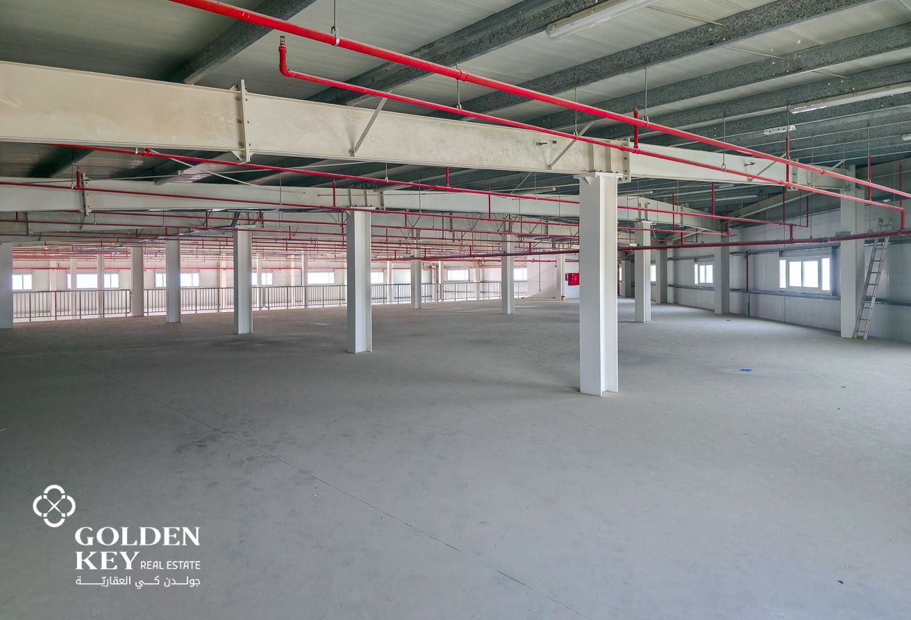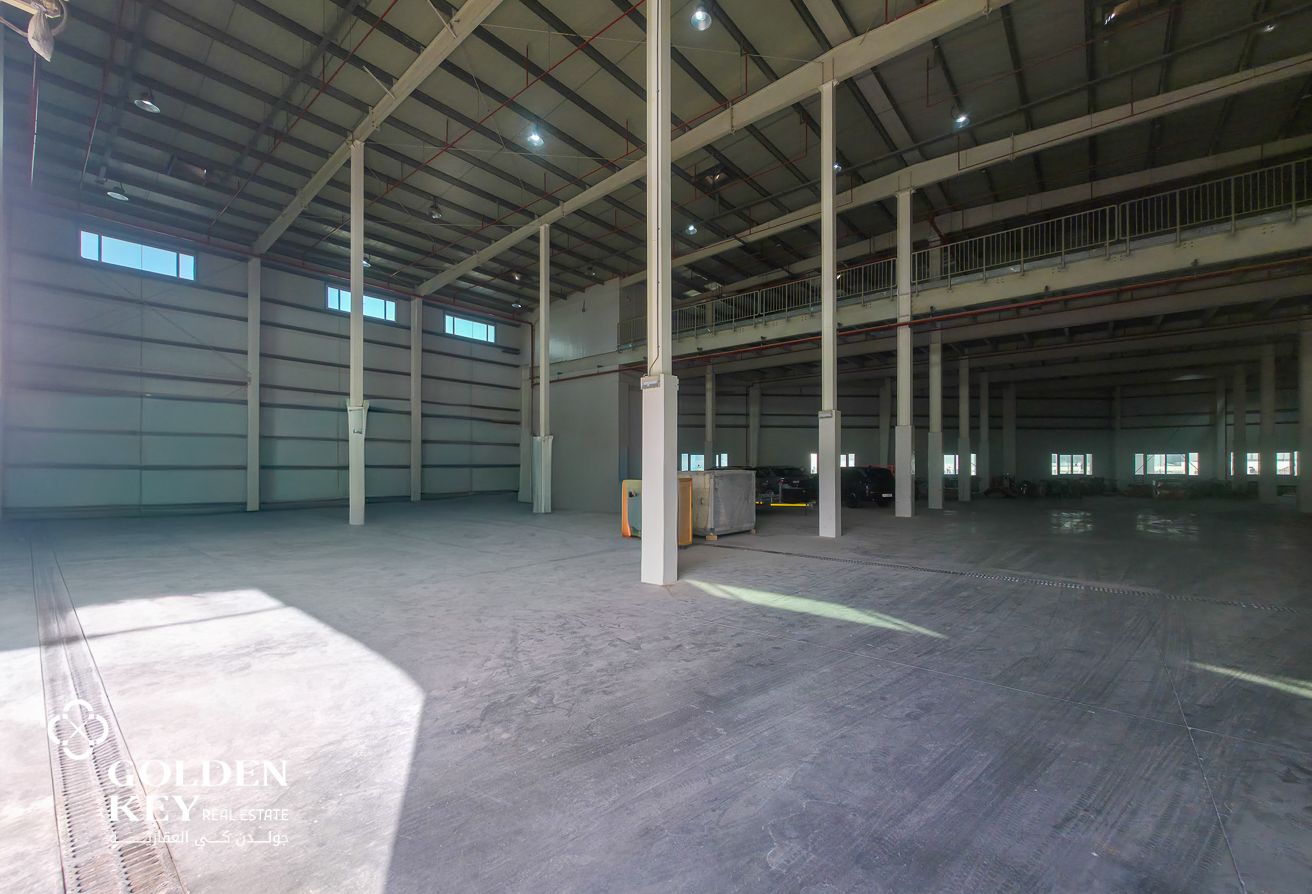 The warehouse features a large open floor plan with high ceilings, providing ample space for racking systems, machinery, or bulk storage. The structure is built with durable materials and designed to accommodate heavy-duty operations. It includes wide shutter doors for easy access and loading, allowing smooth entry and exit of trucks and other vehicles. Additionally, the facility benefits from a solid reinforced concrete floor that can support the movement of heavy equipment and goods. • Total Area size: 1,900 SQM • Warehouse + Mezzanine size: 700 SQM • Well-maintained and excellent condition • Ideal for Storage or business operations
