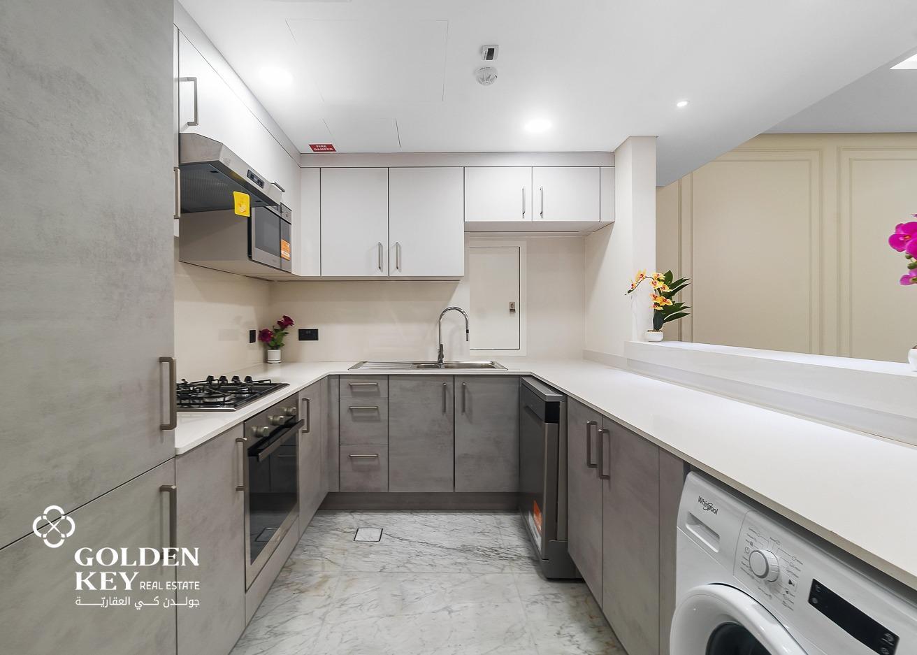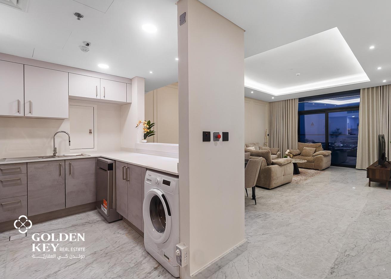Kitchen: Fully equipped with high-end appliances including a refrigerator, oven, microwave, and washing machine. Sleek cabinetry provides ample storage space.